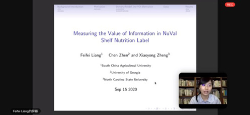 国家农业制度发展研究院的梁菲菲博士在本次网络研讨会上带来了主题为“Measuring the Value of Information of NuVal Shelf Nutrition Label ”的专题演讲。在梁菲菲博士的演讲中,介绍了其研究所使用的需求模型以及量化了在营养价值标签中隐含的信息价值的方法。最后梁菲菲博士的研究成果发现了营养价值标签对家庭购买酸奶的行为产生的是非线性影响,曾经不太关注营养成分标签的消费者对营养价值标签反应更强烈。